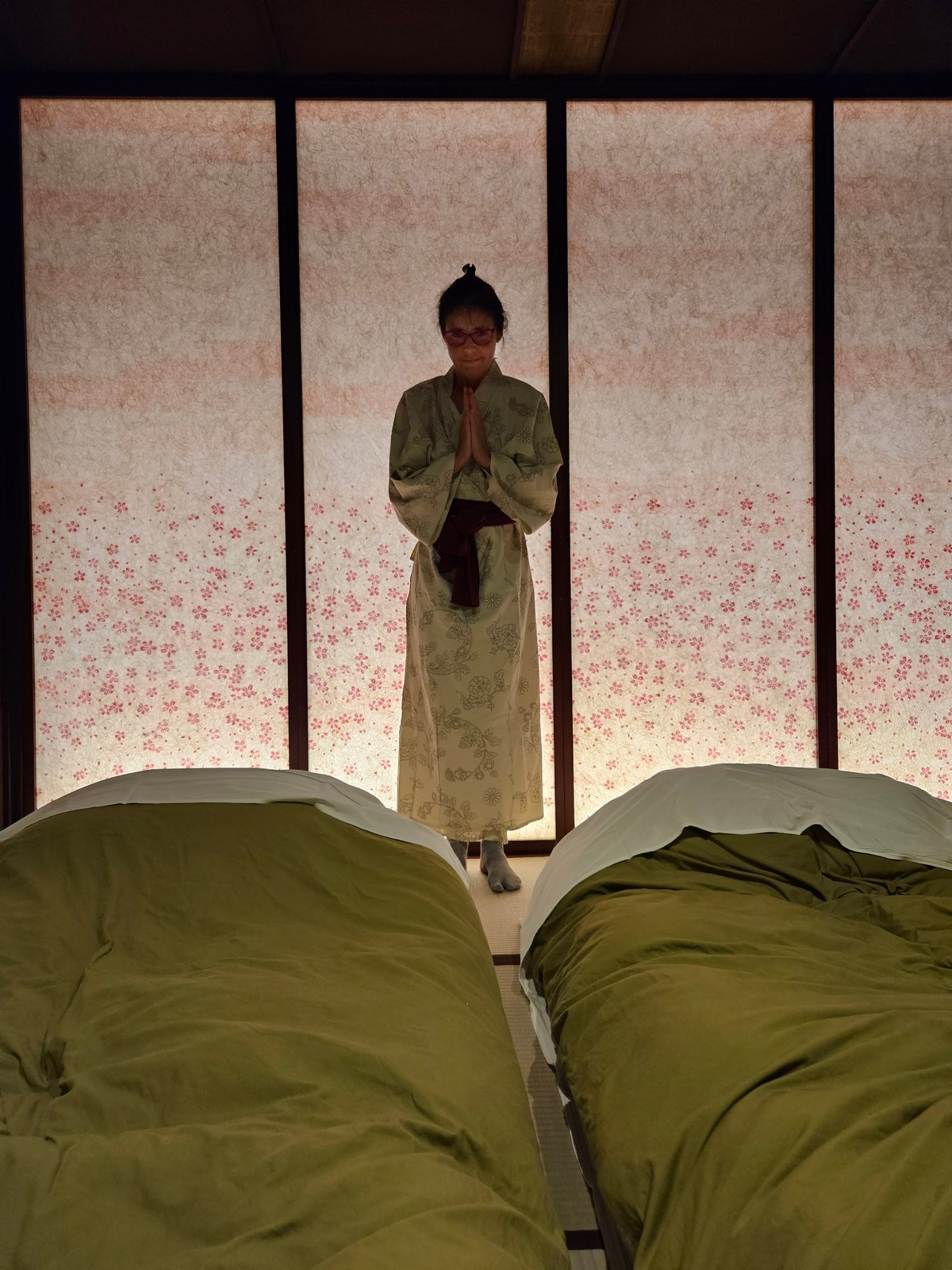 Presto, torniamo al Ryokan per la giappo-experience! Ci accoglie una schiera di ragazze di nero vestite che tra innumerevoli inchini, ci accompagnano alla nostra camera, dove solo le immagini possono raccontare.