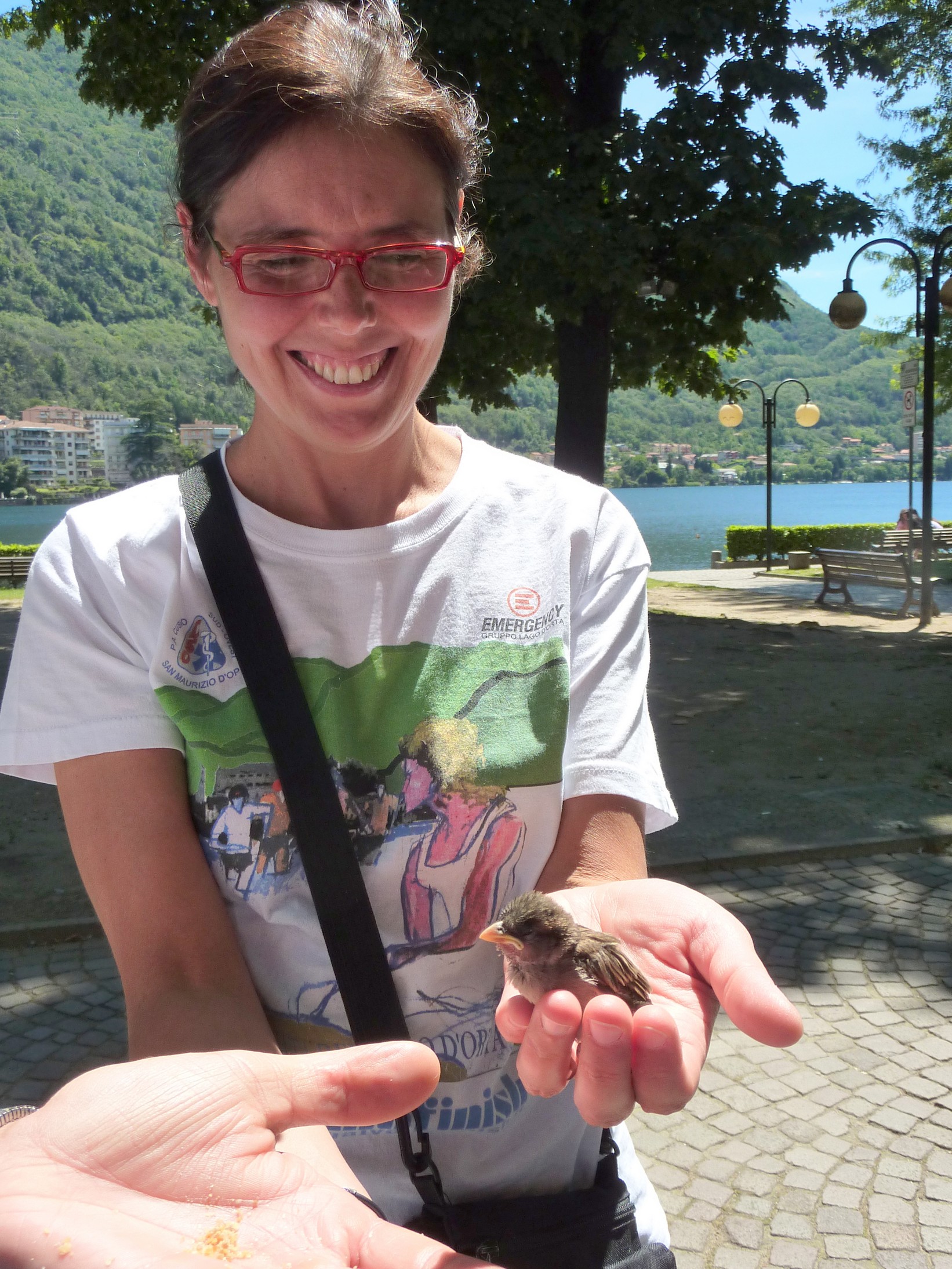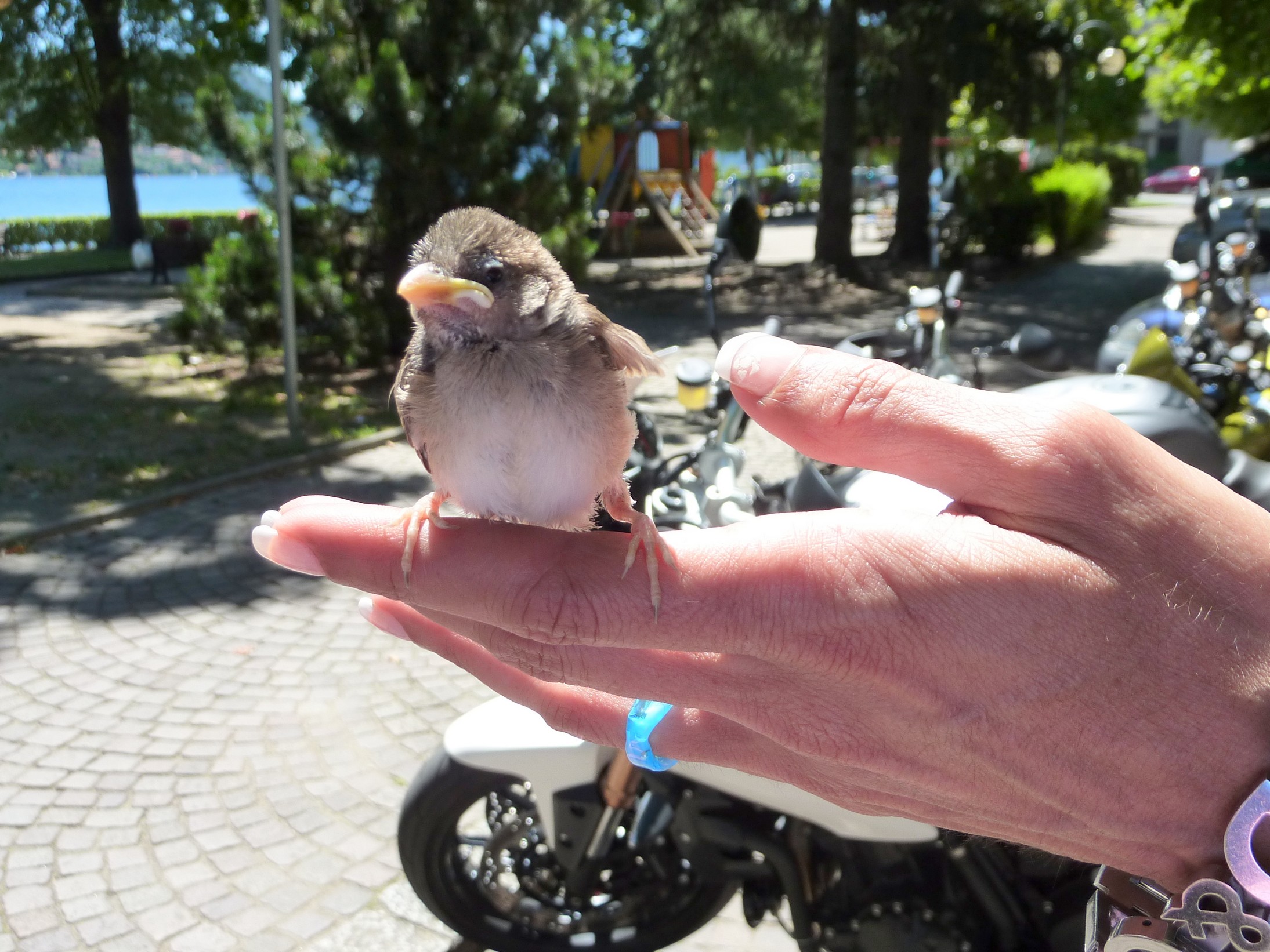 Prima di congedarci, non possiamo non cercar di salvare e coccolare un piccolo passerotto “volato” giù da qualche nido…