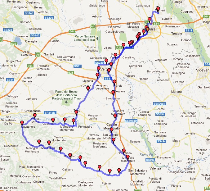 Rifocillati all’ottimo ristorante Il Bagatto di Grazzano Badoglio, paese natale del Maresciallo a cui ha dato i natali e dedicato il nome, per la digestione abbiam proseguito il saliscendi tra Vignale, Lu e Mirabello, dove, livellate le strommine alla pianura, ci siam riportati nell’alto piemonte.