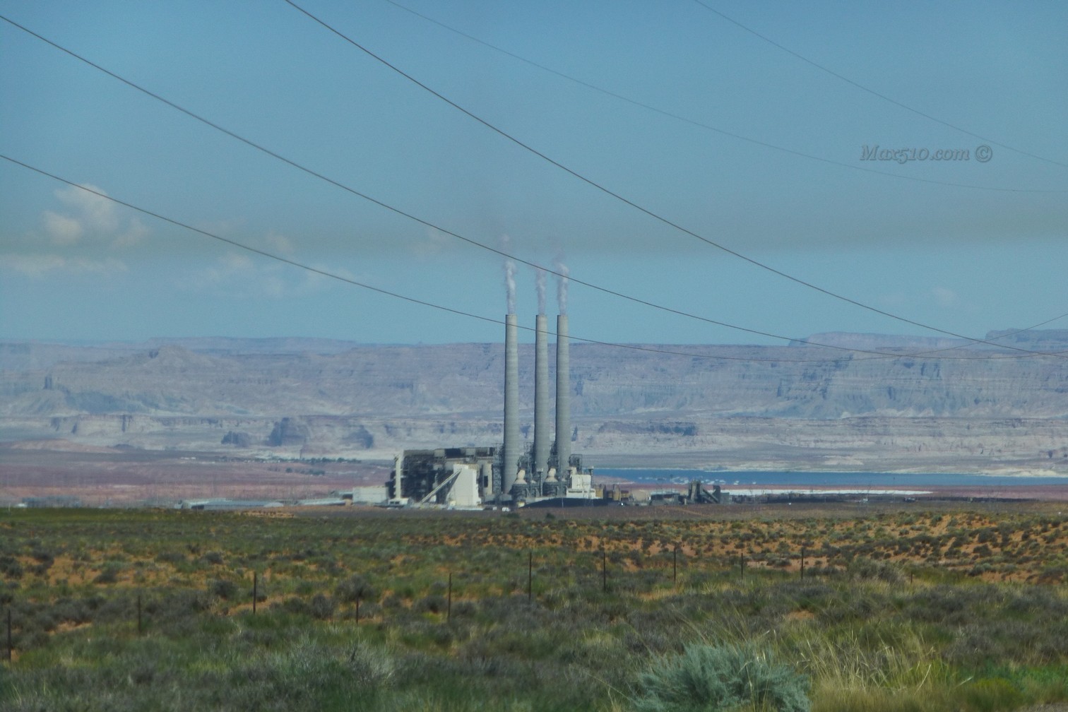 Ad un certo punto, passata una collinetta, la strada inizia a scendere e si intravede in lontananza il paesaggio che fa da contorno al Lake Powell; ma non solo quello, ahimè… Anche una sottile linea di fumo giallognolo si staglia orizzontalmente su di esso o almeno così sembra da lontano.