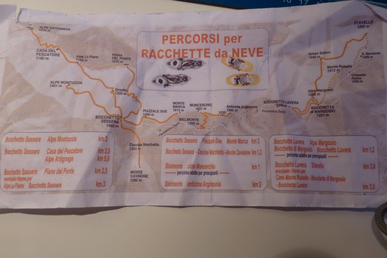Lasciamo l’auto nel piccolo parcheggio del ristorante di Bocchetto Sessera, meta anche di giretti in moto nella bella stagione. Al piccolo chiosco in legno dove si paga anche il ticket per usufruire delle piste da fondo, ci danno utili indicazioni sui vari percorsi per ciaspolatori. Calzate le racchette dirigiamo verso l’Alpe Artignaga, nonostante la poca fiducia nei nostri confronti per la scelta della meta da parte del gentilissimo gestore del chioschetto: ” troppa neve fresca, si affonda, è dura arrivare fin sù…” .