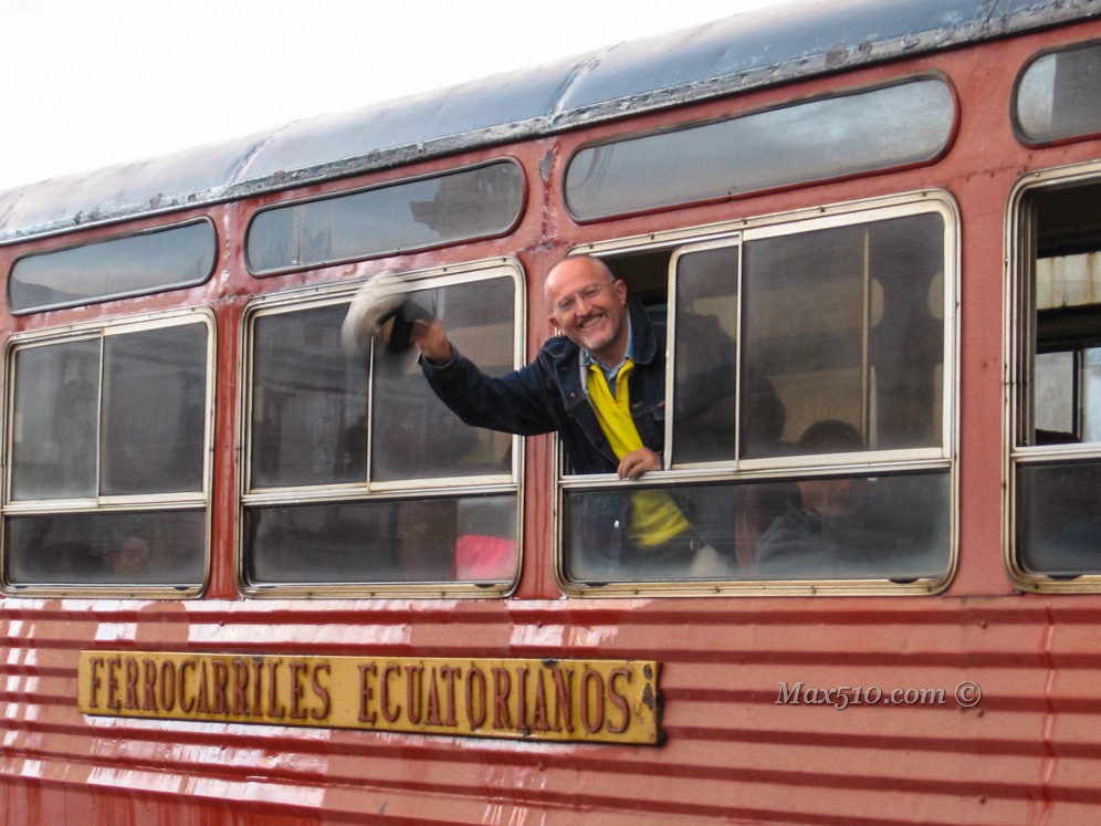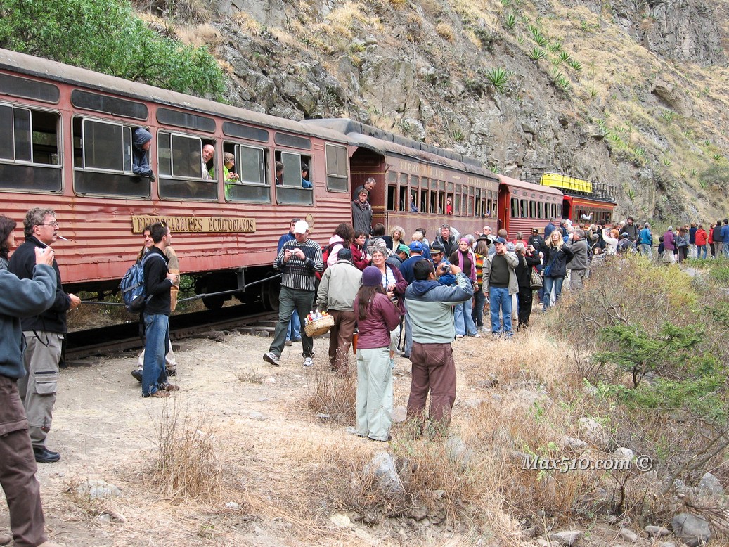 E’ il giorno del trenino. Ci alziamo alle 5 per essere alla stazione di Riobamba molto presto : obbiettivo i posti alla destra del treno perché sono quelli “lato precipizio”, quindi i più spettacolari. Le tre carrozze sono piene di turisti ma vi trovano posto anche alcuni locali, altri si caricano delle sedie di casa sulla motrice e siederanno insieme al macchinista, il quale ci informa che viaggeremo ad una velocità di 20/30 km/h e che impiegheremo circa 7 ore per fare 120 km!!!