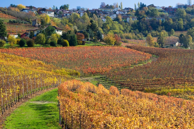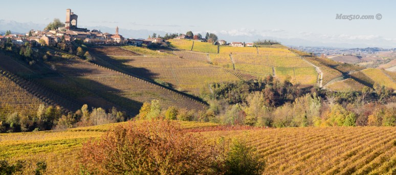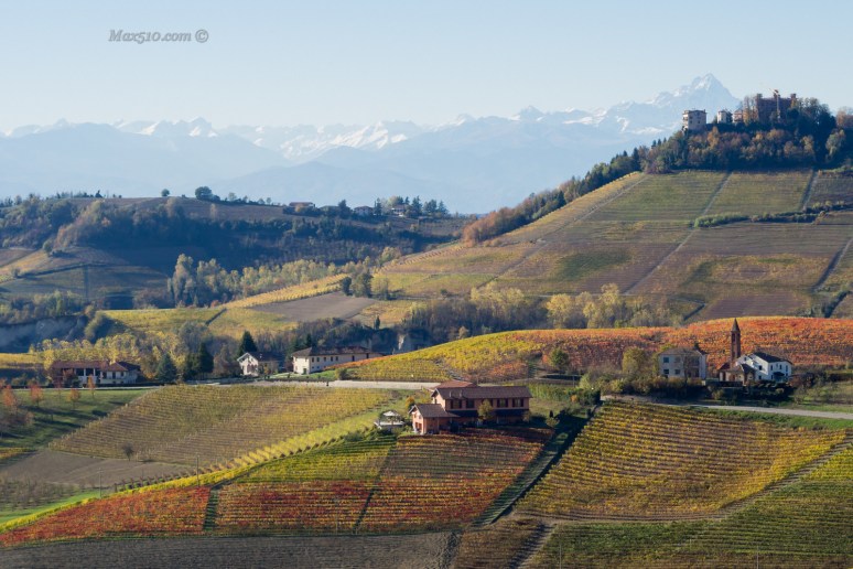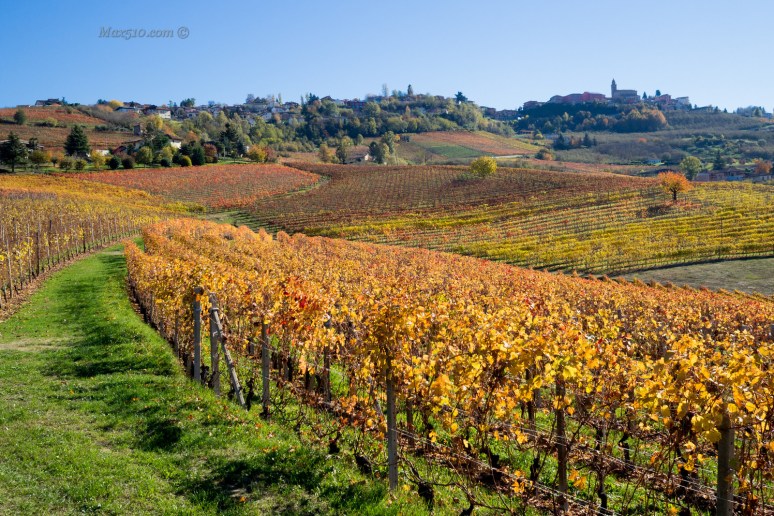 Oltrepassato il Castello di Grinzane Cavour, sulla strada che va verso Diano, è apparso ai miei occhi ciò che una settimana prima avevo potuto solo immaginare: filari di viti colorati, tra il giallo ed il rosso, a contrastare il verde ancora vivo dei prati ed l’azzurro intenso del cielo freddo autunnale.