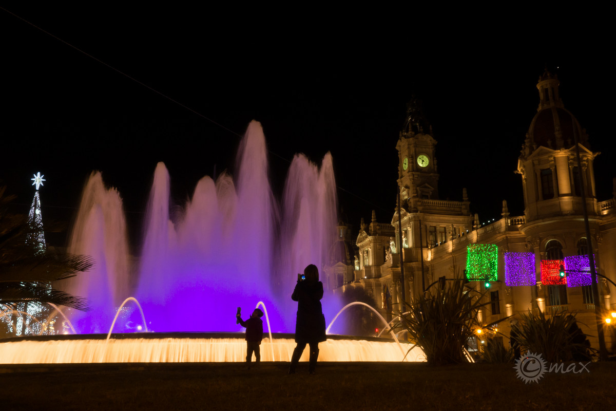 Camminiamo in direzione della stazione, tra negozi di firme famose e bistrot dove molti stanno iniziando il giro delle tapas. Arrivati in piazza del Ayutamento, mi prendo qualche minuto per godermi i giochi della fontana e le sue continue variazioni di colore. Mi affianco ad un fotografato armato di cavalletto e “macchinona” professionale che vuole immortalare la fontana, ma mentre lui impreca per la presenza di una madre che gioca col proprio figlio, io ne apprezzo la presenza fissando i loro momenti di gioia nelle mie foto.