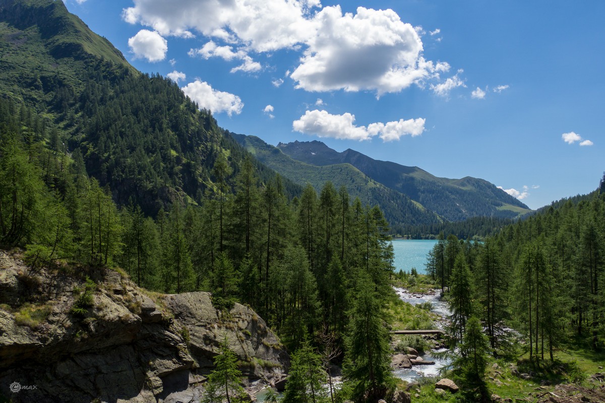 Alla fine del lago il sentiero comincia a salire ed imbocchiamo la valle dove scorre il torrente Loranco, che qui vediamo alimentare le acque del lago…