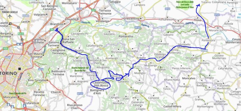 Unendo l’utile al dilettevole, essendo di passaggio a Torino, mi dondolo un po’ sulle colline a sud del Po, dove inizia il Monferrato Astigiano e punto alla Big Bench di Castelnuovo Don Bosco, la mia 25ma panchina gigante.