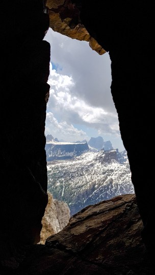 Prima di iniziare la discesa lungo il sentiero 401, entriamo nelle trincee scavate nella roccia durante la Grande Guerra. Pensare un istante alla terribile vita cui erano sottoposti i giovani soldati in quei luoghi, dove morivano per un fazzoletto di terra, mette i brividi.