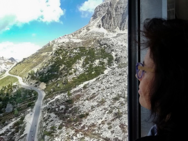 Poco dopo le nove siamo già in biglietteria per salire sulla mitica funivia rossa del Lagazuoi. Nonostante l’addetto ci sconsigli la discesa a piedi a causa di tratti ancora innevati lungo il sentiero, non ci lasciamo intimorire e paghiamo solo la salita.