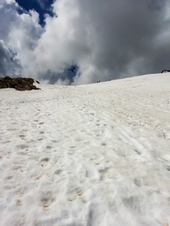 Qualche marmotta ci accompagna col suo inconfondibile fischio, fino a che la magia inizia ad affievolirsi a causa delle centinaia di persone che ora affollano il piazzale del passo per assistere, se non partecipare, alla corsa ciclistica in programma…