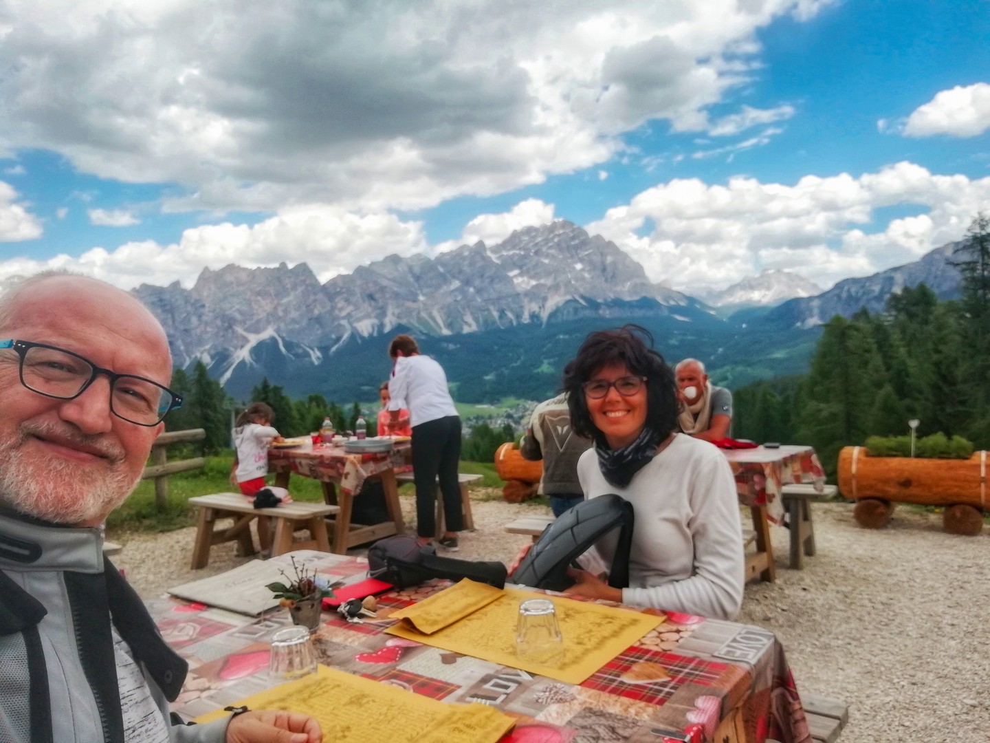 Dobbiamo scendere di nuovo verso Cortina per riprendere il passo Giau: il Falzarego ed il Valparola sono ancora chiusi. Prima di raggiungere il bivio, troviamo sulla sinistra le indicazioni per la Baita Resch dove ci rifocilliamo con ottimi piatti, ammirando il panorama sulla Conca d’Ampezzo ed i monti che la circondano.
