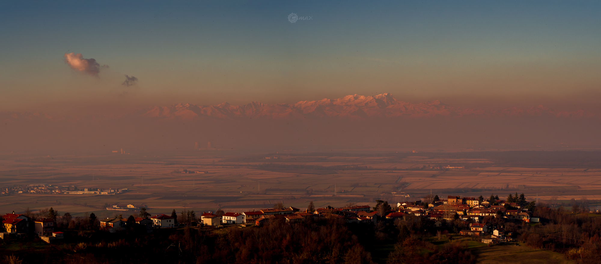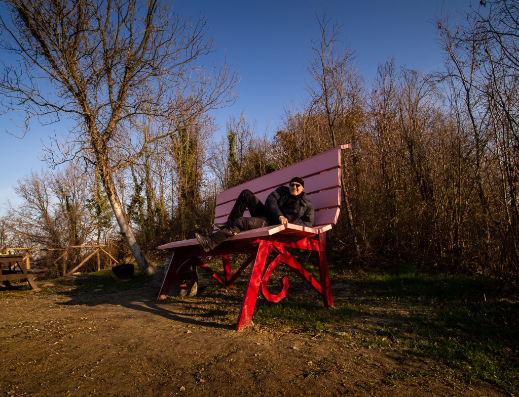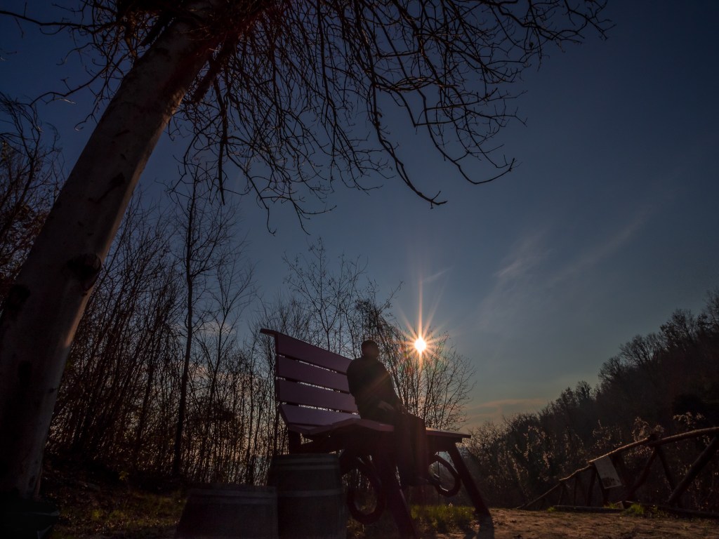 Per raggiungere la Big Bench lascio la moto lungo la strada e mi avvio lungo il sentiero in leggera salita all’interno di un bosco, accompagnato solo dal vociare dei passeri. Pochi minuti di cammino e sbuco su un balcone naturale che si affaccia sul Po e la pianura vercellese. In lontananza, il profilo inconfondibile del Monte Rosa che sbuca dalla bruma padana, tingendosi appunto di rosa, come accade durante le albe ed i tramonti invernali…