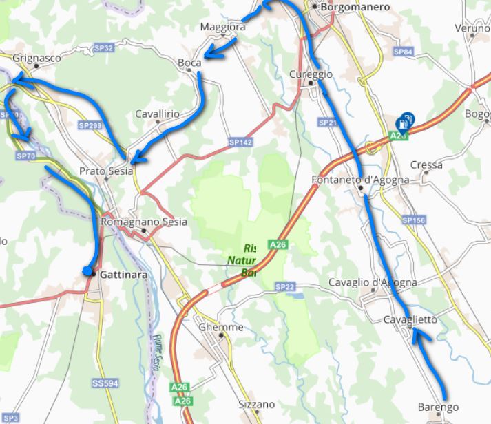 Da Barengo, salire verso nord direzione Borgomanero. Poi indicazioni per Maggiora e Prato Sesia; il ponte sul Sesia che univa Romagnano a Gattinara è stato portato via dall’ultima alluvione lo scorso autunno, per cui bisogna proseguire per Borgosesia ed una volta oltrepassato il fiume, alla rotonda svoltare a sinistra in direzione Gattinara, seguendo la costa del Sesia.
