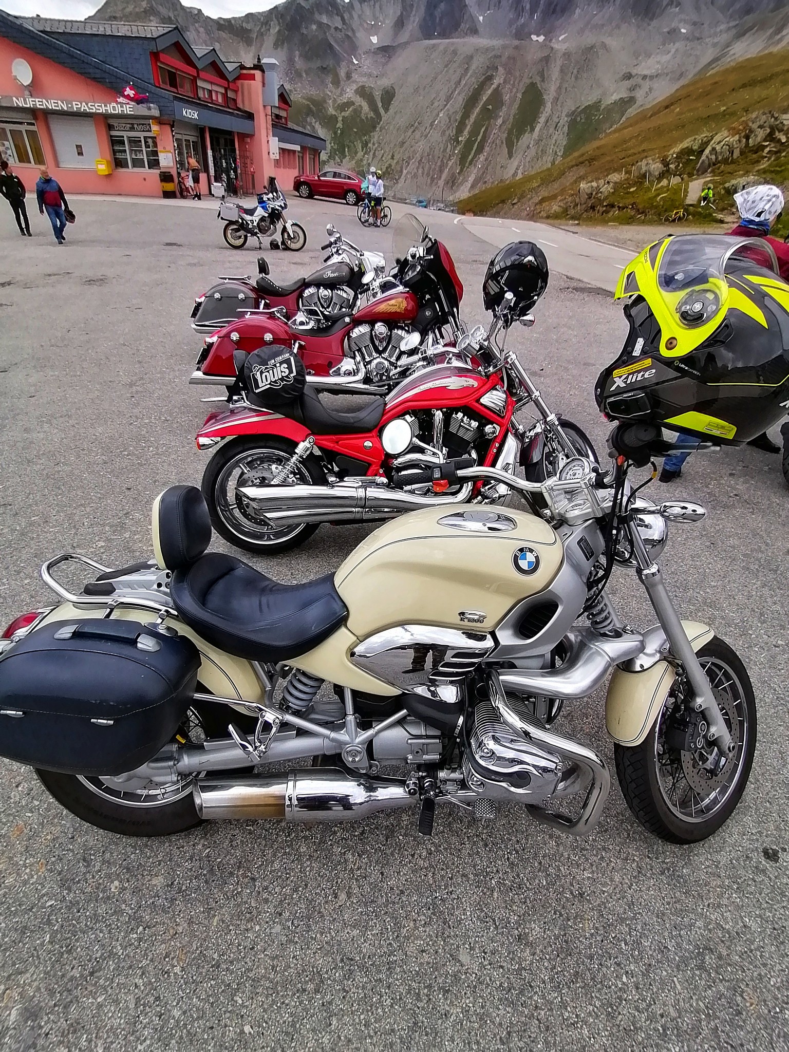 Una volta in cima, parcheggio a fianco di moto degne della compagnia di Penny e mi vado a rifocillare all’unico rifugio sul passo.