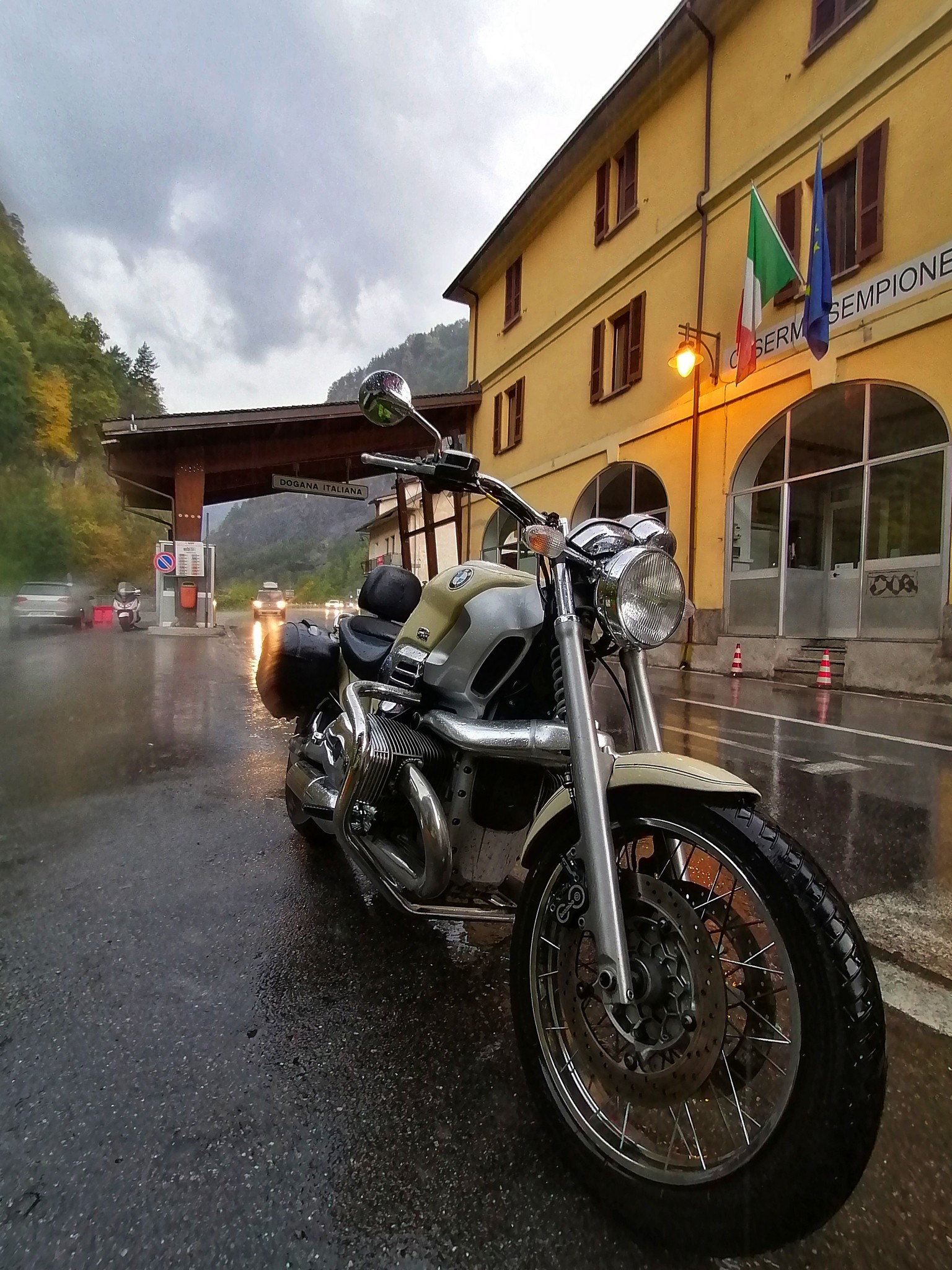 Questa volta i lavori in galleria mi aiutano a trovare un primo riparo per vestirmi ed indossare “l’ombrello”. Proseguo sulle uova ma in dogana sono costretto a fermarmi perché la pioggia è diventata battente. Sotto lo sguardo di un paio di curiosi finanzieri fermo Penelope e la lascio impavida sotto la pioggia mentre io trovo conforto sedendomi ai tavoli dell’unico bar, ahimè chiuso, ma almeno riparato sotto il suo dehor.