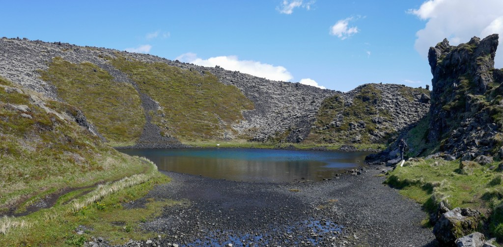 Foto di rito e via verso il Saxhóll Crater. Un vulcanetto ormai spento, nero con sfumature rosse. E’ stata costruita una lunga scala di metallo poco ripida che lo abbraccia per circa un quarto. Sulla sommità un bel vento, forte a tal punto che se lanci in aria sassi di lava, se li porta via! Purtroppo, la cima per la Volcano Goddess (iooo!) è una delusione. Mi spiego, mi aspettavo un cratere scuro e profondo, invece ho trovato un bel praticello. Ma vale sempre la pena salire e girarci intorno. Immancabile la meridiana installata nel punto di miglior panorama, con punti cardinali e nomi delle città che trovi “là in fondo”, oltre l’orizzonte.