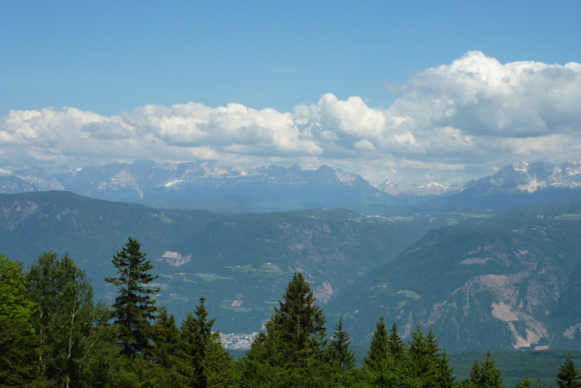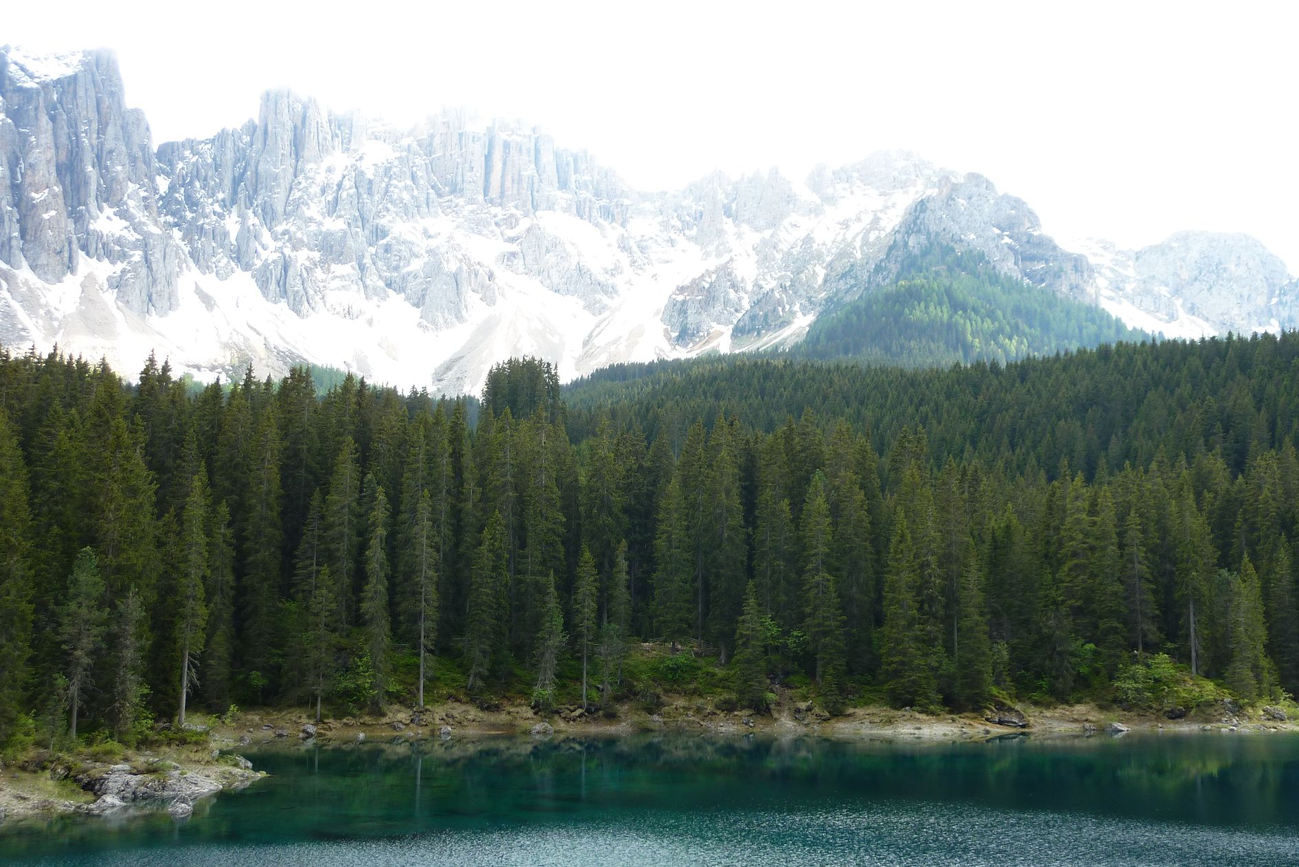 Scendiamo a Bolzano che passiamo abbastanza in fretta ed imbocchiamo la Val d’Ega, che ci accoglie nelle sue strette gole sotto un cielo minaccioso. Per fortuna la minaccia resta tale e basta, anzi va ad affievolirsi per farci ammirare il “giardino delle rose” con qualche raggio di sole; ci fermiamo per fare quattro passi lungo le sponde del lago di Carezza, sotto il Latemar purtroppo avvolto in una nube dispettosa.