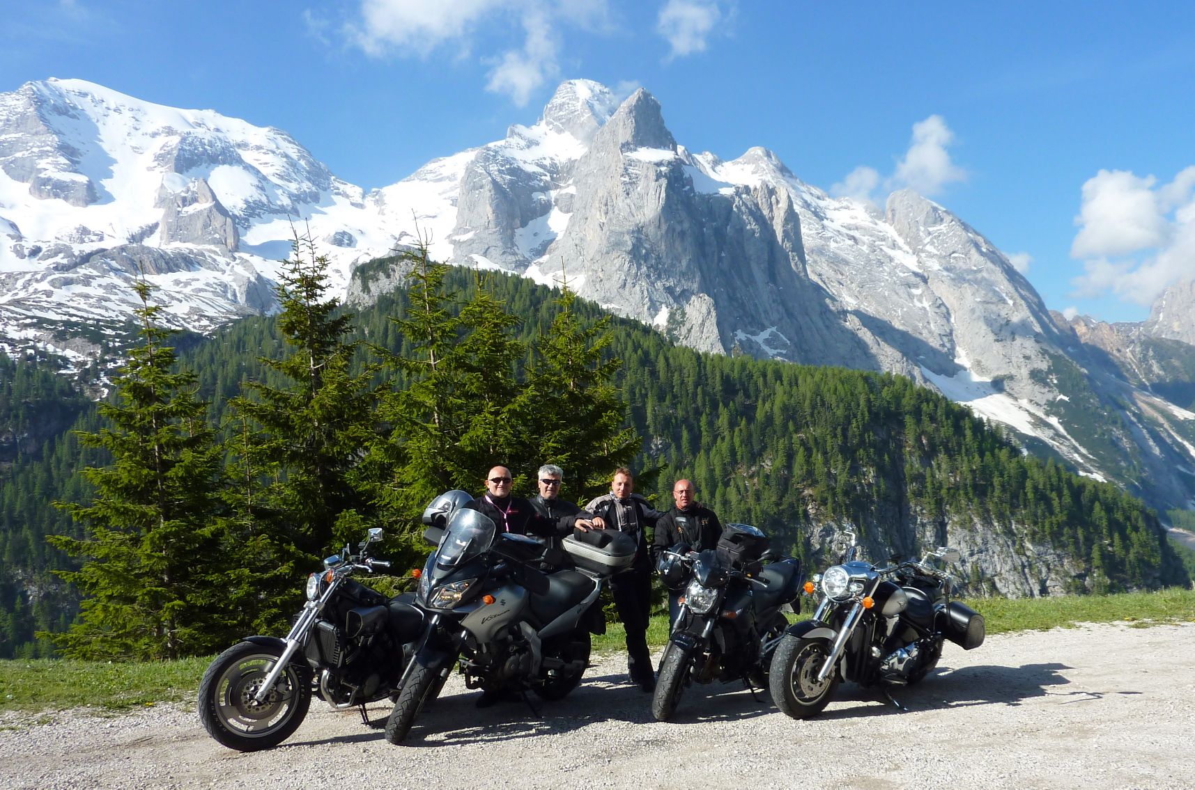 Belli freschi, in tutti sensi (9°c la temperatura alla partenza da Canazei), riprendiamo i nostri cavalli più o meno ferrati e più o meno cromati ed iniziamo la scalata alla Marmolada o meglio al passo Fedaia che sta alle sue pendici.