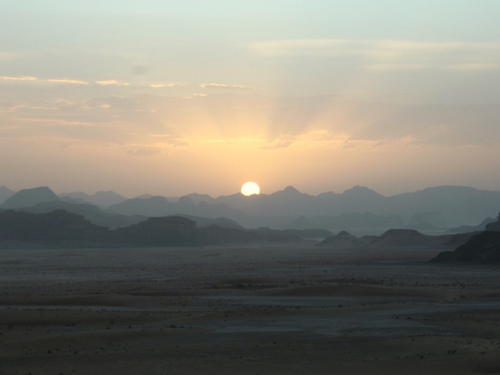 Dopo il pranzo nelle tende beduine, nel tardo pomeriggio giringiro per il wadi con le jeep fino al tramonto, ammirato su uno spuntone di roccia nell’assordante silenzio del nobile deserto rosso.
