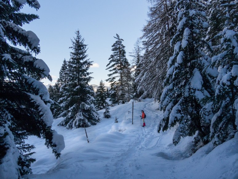 In un primo momento decidiamo di proseguire. Lo spazio tra gli alberi della pineta sembra quello del sentiero percorso finora ed ad un certo punto iniziamo a scendere. Non trovando però più alcuna indicazione ne i classici segni bianchi e rossi dei percorsi, scesi più di cento metri in un tratto tra l’altro abbastanza ripido, decidiamo prudentemente ma a malincuore di tornare sui nostri passi.Relive ‘Ciaspolata 13-01-2018’